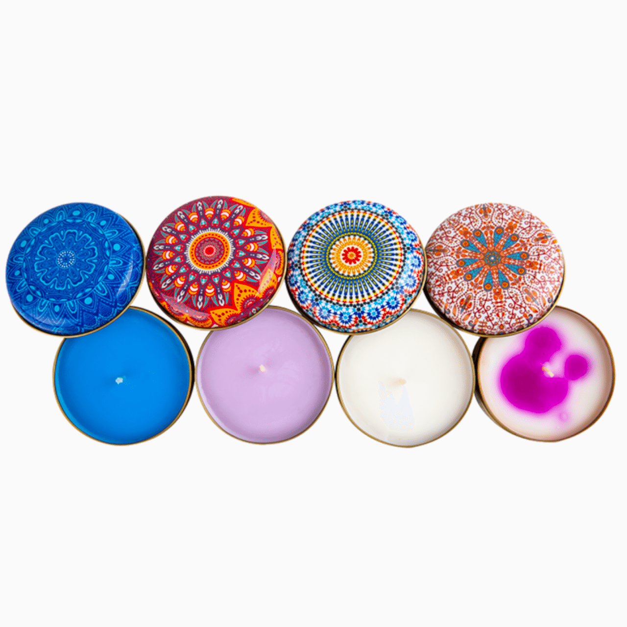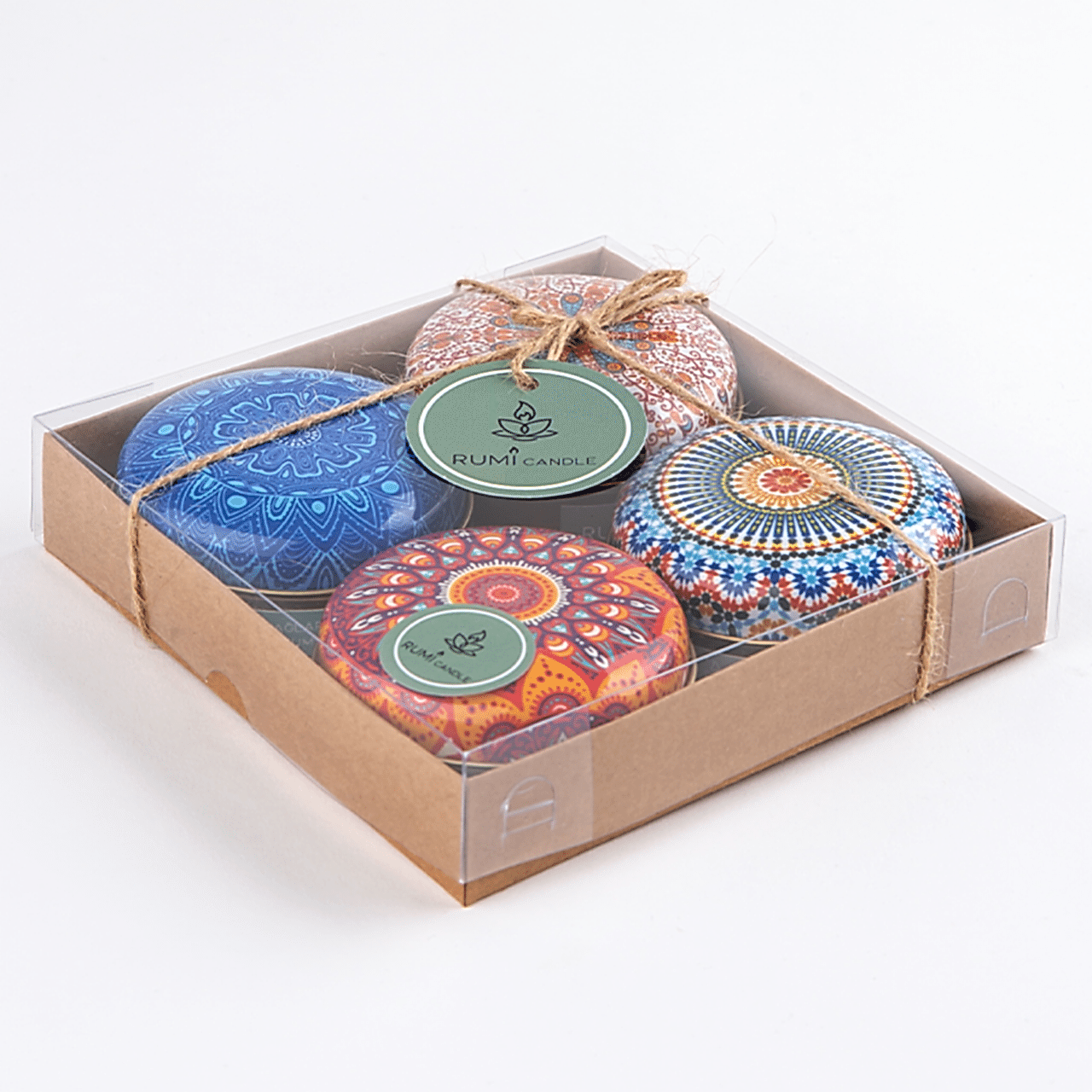 • 4 ESANSİYEL AROMATERAPİK YAĞDAN ÜRETİLMİŞ ESASNLI TENEKE KUTULU MUM.